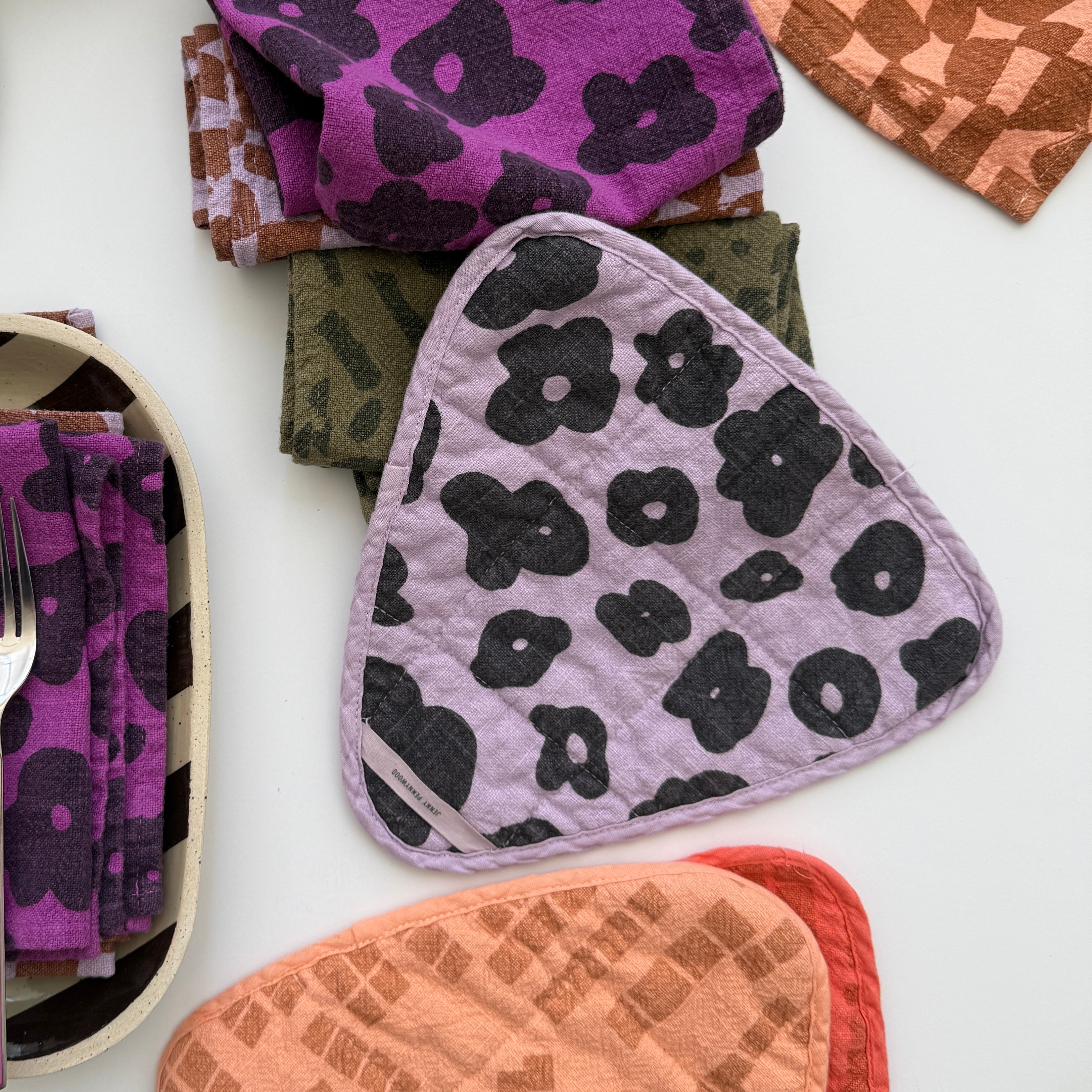 Part of our trio of potholder shapes - the Triangle Potholder! A bright pop of color for grabbing hot handles, tippin’ teapots, and bringing good vibes to cool cooks and fun kitchens everywhere. Made with our signature linen-cotton blend and a layer of heat resistance sewn in.